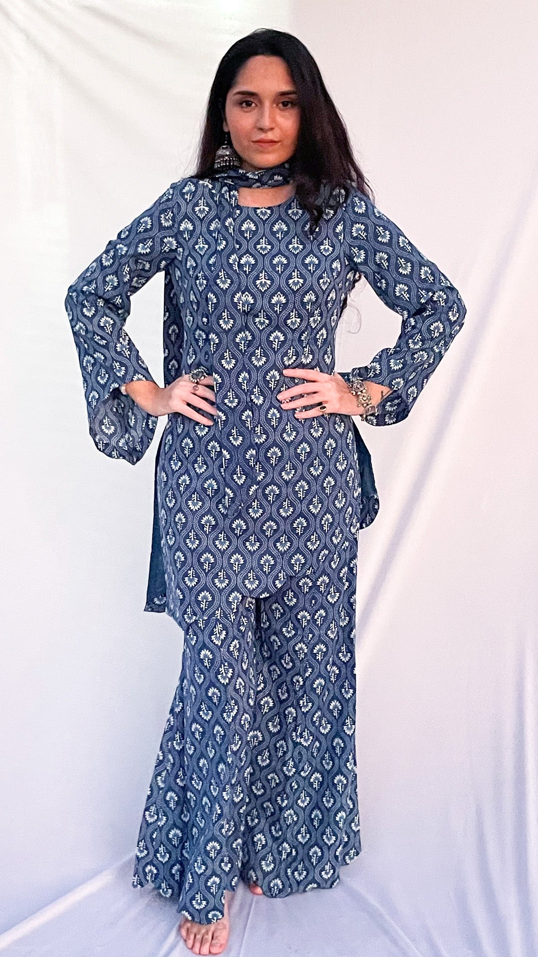 Blue Handblock Printed Corset Kurti Set with Slit Sleeves & Dupatta And Scarf