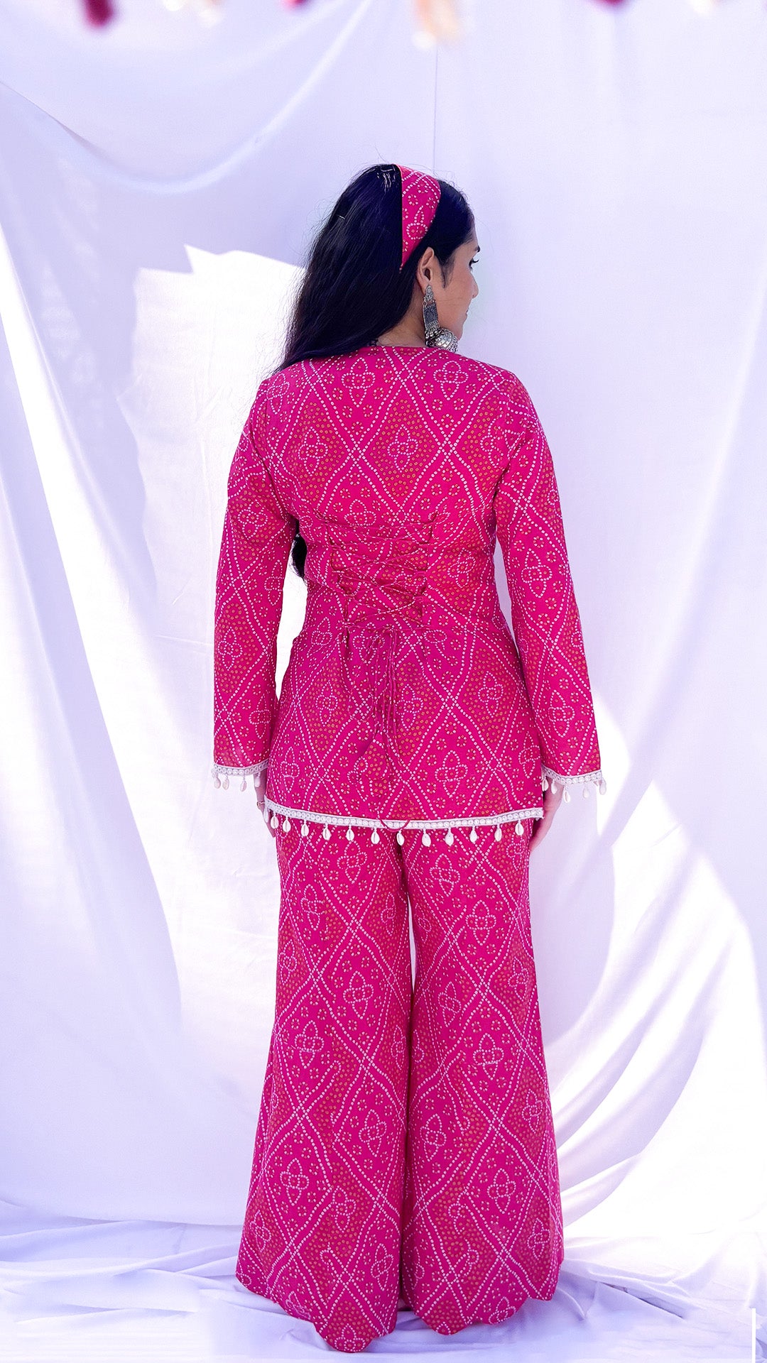 Pink Bandhani Print Co-ord Set with Corset Back & Scarf